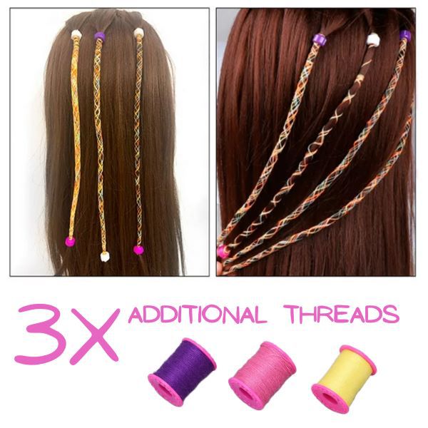 - Lieferumfang: 1x Haarflechtmaschine, 12x Haarspangen, 3x Garn (gelber, rosa und violetter Faden), 2x Zubehör zur leichteren Handhabung